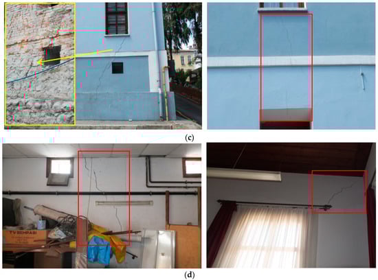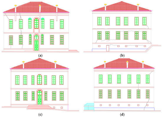 Schematic views of the damage found in the building investigated: (a) front facade, (b) left facade, (c) right facade, and (d) back facade.