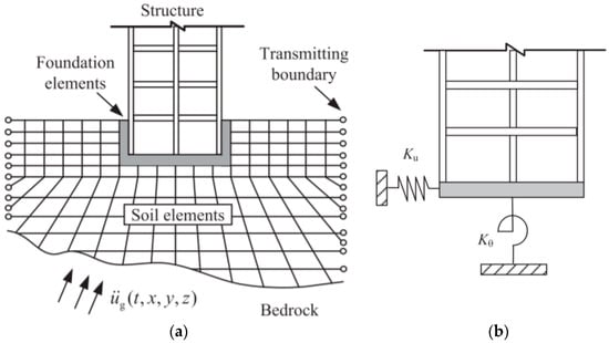 Schematic views of soil–structure interaction: (a) direct soil–structure interaction approach, and (b) sub-structure approach [].