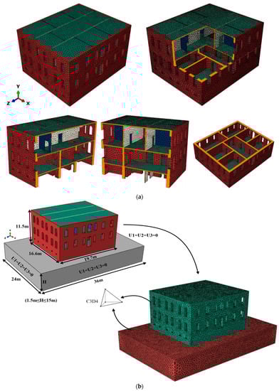 The FE method is a practical tool to obtain the structural behavior of structures numerically. It is particularly useful when applied to determine the simulation of any unforeseen situation. This part presents the FE model of the historical building with and without the soil–structure system. The FE model of the building was developed using Abaqus 6.14 software []. The macro-modeling method, in which blocks, mortar, and block–mortar interface are smeared out in the continuum, was applied to represent the masonry walls. The blocks and mortar are modeled as a homogeneous and continuum material in the macro-modeling approach, and their mechanical properties are used in nonlinear finite element analysis. This approach is used to model relatively larger and more complicated masonry structures.