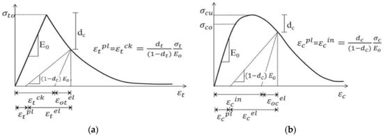 Stress–strain diagrams of the CDP model: (a) uniaxial tension and (b) uniaxial compression.