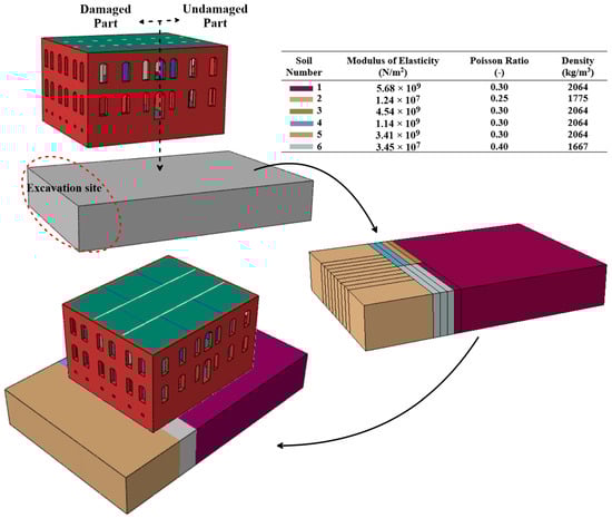 The soil domain was divided into grids to obtain the damage to the building following the soil settlement caused by the excavation activity near the building (Figure 12). The settlement effect was considered by defining weak soil properties for the back and left sides where damage to the building is cumulated. The intention was to capture the potential impact of soil settlement caused by the excavation on the structural integrity of the building. For this aim, the elasticity modulus and densities of soil domains were defined to be different using a trial-and-error procedure. The procedure was employed until the damage propagation on the building was obtained. It should be stated that, wherever possible, the soil properties were gradually increased from weak soil to hard soil to eliminate the settlement effect. The material properties of the soil domains, which are available in the literature, are also shown in Figure 12 [,,]. As can be seen, the elasticity modulus values changed between 1.14 × 109–5.68 × 109 N/m2 while the density values changed between 1667–2064 kg/m3. Also, the Poisson ratio changed between 0.3–0.4.