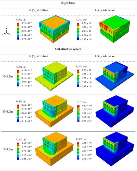 The nonlinear analyses were employed to determine the soil settlement effect and the following damage to the building. For this aim, the rigid-base condition and soil–structure interaction systems were also employed. During the analyses, the dynamic explicit procedure was taken into account with the self-weight of the building taken as vertical load. At the end of the analyses, the displacement contour in the U2 (Y) and U3 (Z) directions for both conditions were obtained and presented in detail. Figure 13 shows the displacement contour diagram obtained from the rigid-base condition and the soil–structure interaction system. Moreover, Figure 14 presents the deformed and undeformed shapes and the change of displacements along the height of the building (U3 direction) for the soil–structure interaction system. As can be seen, the soil–structure interaction system was detailed under the different soil depths. This provided a determination of soil depth effects on the results obtained. From Figure 13 and Figure 14, it appears that the damage to the building was obtained at the facades where the soil was excavated. Also, the maximum displacement values increased with the increasing soil depth, as can be seen in Figure 14. Table 4 presents the comparison of the maximum displacement values. The maximum displacements were found to be 22 mm in the U1 direction and 85 mm in the U3 direction for the 9.0 m soil depth. Furthermore, it can be concluded that as the height of the weak soil increased, the deformation of the building also increased.
