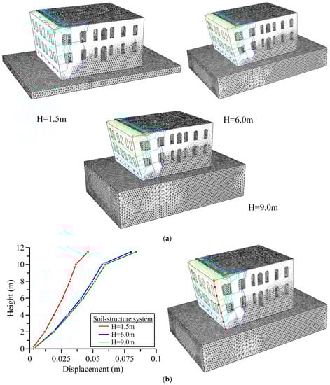 (a) Deformed and undeformed shapes and (b) the change of displacements along the height of the building at the U3 direction for the soil–structure interaction system for the different soil depths.