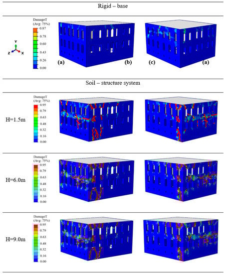 The damage variables change in value from 0 to 1. The value of 0 represents the undamaged material, while the value of 1 represents the total loss of strength and complete deterioration of the material []. In the study, the tension damage factor, dt, was employed due to the nature of the masonry. Figure 15 shows the tension crack propagation of the building for different conditions. As shown in Figure 15, the building was almost undamaged at the rigid-base conditions. From Figure 15, it can be seen that serious damage was sustained by the masonry walls in the case of the soil–structure interaction system. Table 5 presents the number of damaged masonry elements by all masonry elements. One can see from this table that the highest percentage of damaged elements was obtained for the 6 m soil depth. It should be stated that the crack propagation on the masonry walls was similar where the soil heights were 6 and 9 m. This means that the soil depth of 6 m is acceptable to take into account the soil–structure interaction system. It should be noted that the soil depth employed can be determined in accordance with the total building height. Here the sum of the rigid basement and soil depth can be selected to be equal to the total height of the building participating in free vibration.