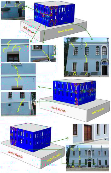 The damages to masonry walls cumulated on the front, left, and back facades of the building. This was similar to in situ damages to building (refer to Figure 15). As can be seen, the cracks on the walls appeared in the form of diagonal and incline tension cracks. Also, some cracks occurred along the horizontal bed joints. The damages occurred around the openings. Figure 16 shows a comparison of damage propagation obtained from the numerical model and existing damage propagation. Figure 16 indicated that there are definite similarities between the two.