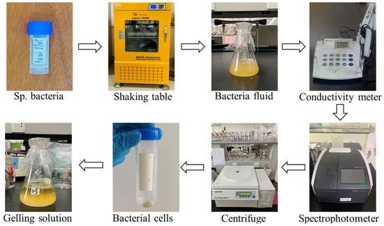 The MICP gelling solution, a mixture of bacteria and cementation solution, was used to prepare contaminated soil treated by MICP. The process was as follows: (a) The culture medium was autoclaved at the temperature of 121 °C for 2 h. As the culture medium cooled to room temperature and used a pipette to inoculate the bacteria into the culture medium, with an inoculation ratio of 1/100 (V bacteria/V culture medium) []. (b) Then the inoculated medium was cultivated in a constant temperature oscillation incubator at a speed of 180 rpm and a temperature of 30 °C. The urease activity, 22–30 mmol/L urea hydrolyzed·min−1, was measured by the electric conductivity method [], OD600 = 0.8–1.2, was determined by the optical method using a spectrophotometer (model: UV-190i) []. In order to separate the supernatant and bacterial cells, the bacterial suspensions were centrifuged at a speed of 8000 rpm for 10 min. (c) According to the test scheme, the cementation solution and its specific ratio were preset, which were 0.25 mol/L, 0.5 mol/L, 1 mol/L, 1.5 mol/L, and 1:1, 1:1.5, 1:2, and 1:2.5, respectively. (d) Finally, the cementation solution was dissolved in the medium, and then all the isolated bacteria were stripped into each medium and mixed for preparing the MICP gelling solution (Figure 2).