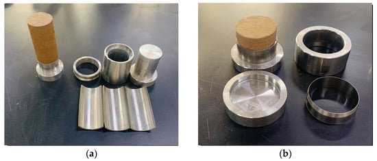 According to the Standard for Geotechnical Test Methods (GBT50123-2019) [], microbially solidified contaminated soil specimens were prepared by the mixing method. It is noted that in order to ensure a consistent moisture content of the specimen, the MICP gelling solution added during the preparation process was equal to the amount of pure water added. The optimum moisture content and dry density of the specimens were 12.8% and 1.60 g/cm3, respectively. During the preparation process, specimens with a height of 80 mm and a diameter of 39.1 mm, a height of 20 mm and a diameter of 61.8 mm, and a height of 40 mm and a diameter of 61.8 mm were used for the unconfined compressive strength (UCS) test, direct shear (DS) test and penetration test (PT), respectively (Figure 3). Additionally, the prepared specimens were wrapped in cling film and placed in a constant temperature and humidity environment (a temperature of 25 °C and a relative humidity of 95%) for 3, 7, 14, and 28 d, respectively [,].