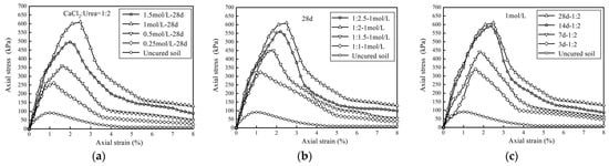 The types of axial compression damage of soils were usually divided into strain-hardening and strain-softening characteristics. On this basis, the stress–strain relationships of soils were classified into six types: strongly hardened, generally hardened, weakly hardened, strongly softened, generally softened, and weakly softened, so as to better describe the stress–strain curves of geotechnical materials []. Figure 5 presented the stress–strain relationship of Zn-contaminated soil treated by MICP subjected to different conditions. It could be seen that the stress–strain relationship of specimens showed the characteristics of softening type. With the improvement of microbial mineralization, the strain value corresponding to the peak among the curve increased gradually. Specifically, when the cementation solution ratio and curing age were constant (Figure 5a), the stress–strain relationship of specimens gradually changed from weak softening type to strong softening type with the increasing cementation solution concentration. It is noted that the stress–strain relationship had changed from the weakly softened type of the untreated specimen to the generally softened type of the treated specimens at an initial cementation solution concentration of 0.25 mol/L. As shown in Figure 5b, the stress–strain relationships of the specimens developed from weak softening type (uncured soil) to generally softening type (1:1.1, 1:1.5) and strongly softening type (1:2, 1:2.5), respectively, with the increase of cementation solution ratio. Similarly, Figure 5c showed a similar pattern of change, the stress–strain curve of the specimen changes from weakly softened to strongly softened with the increase in curing age. It indicated that the MICP treatment could transform the softening characteristics of soil stress–strain relationship from weak type to strong type, which was the realization of strength enhancement and deformation reduction for specimens.