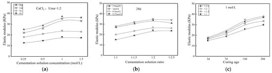Typical elastic modules variation curves of specimens treated by MICP: (a) The variation of elastic modulus with cementation solution concentration; (b) The variation of elastic modulus with cementation solution ratio; (c) The variation of elastic modulus with curing age.