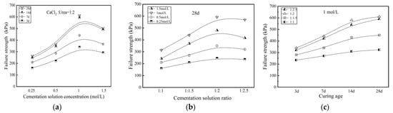 Typical failure strength variation curves of specimens treated by MICP: (a) The variation of failure strength with cementation solution concentration; (b) the variation of failure strength with cementation solution ratio; (c) the variation of failure strength with curing age.