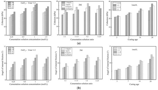 Figure 8 presented the shear strength characteristics of specimens treated by MICP subjected to different conditions. The cohesion and internal friction angle of specimens showed a tendency of increasing firstly and decreasing subsequently with the increasing cementation solution concentration and its ratio, while they kept growing with the increasing curing age. For quantitative analysis, the cohesion and angle of internal friction of specimens with the same cementation solution concentration were selected. It was found that the growth of cohesion was positively correlated with the curing age with a maximum growth of 84.4%, while the upward trend of internal friction angle was not obvious, whose increase was less than 10%. In this regard, it is speculated that the increase in calcium carbonate production promoted the cementation of soil particles, while its effect on the soil particle friction was not significant [,].