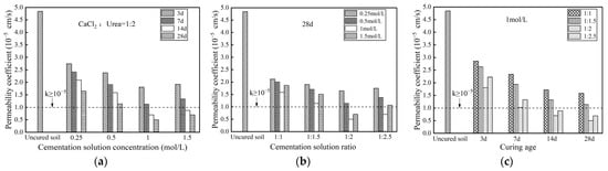 Permeability coefficient of specimens treated by MICP subjected to different conditions: (a) The variation of permeability coefficient with cementation solution concentration; (b) The variation of permeability coefficient with cementation solution ratio; (c) The variation of permeability coefficient with curing age.
