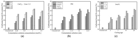 The proportion of carbonate-bound Zn content among specimens treated by MICP subjected to different conditions: (a) The variation of carbonate Zn content proportion with cementation solution concentration; (b) the variation of carbonate Zn content proportion with cementation solution ratio; (c) the variation of carbonate Zn content proportion with curing age.