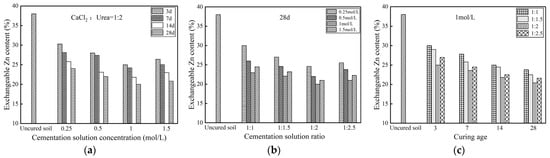 The proportion of exchangeable Zn content among specimens treated by MICP subjected to different conditions: (a) The variation of exchangeable Zn content proportion with cementation solution concentration; (b) the variation of exchangeable Zn content proportion with cementation solution ratio; (c) the variation of exchangeable Zn content proportion with curing age.