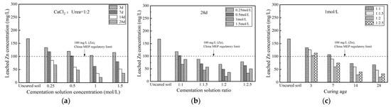 Leached concentration of zinc ions among specimens treated by MICP subjected to different conditions: (a) The variation of Zn leaching concentration with cementation solution concentration; (b) the variation of Zn leaching concentration with cementation solution ratio; (c) the variation of Zn leaching concentration with curing age.