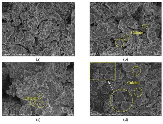 To investigate the effect of MICP treatment on the internal structure of Zn-contaminated soil, the specimens with a cementation solution ratio (CaCl2:urea) of 1:2 and a curing age of 28 d were selected for analysis. Figure 13 presented the SEM images of specimens treated by MICP. It could be seen that the untreated specimens had a looser particle structure, while that of the treated specimens was denser. During the MICP treatment, the calcium carbonate crystals presented between the pores of the soil particles mainly played the role of filling the pores, while the carbonate crystal aggregated wrapped around the adjacent soil particles played the role of cementing the soil particles, and this part of the calcium carbonate crystals could improve the cohesion between the soil particles and significantly increase the strength of the soil. With the microbially induced mineralization reaction, due to the presence of zinc ions in the contaminated soil, the consumption of CO3− in the cementation solution was accelerated and the amount of carbonate production rapidly increased, and the dispersed small granular calcium carbonate crystals began to aggregate, and under room temperature conditions (25 °C), the calcium carbonate crystals were continuously converted into calcite, which had a better cementing effect [].