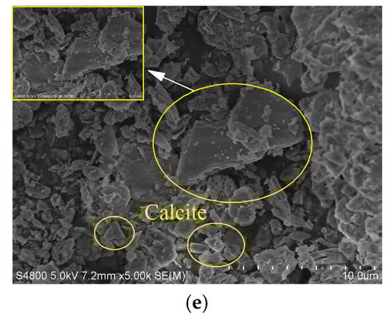 In addition, the treatment effect of the specimens depended largely on the cementation solution concentration. Specifically, the protein and extracellular polymer matrix of bacterial epidermal cells controls the morphology of calcium carbonate precipitation. The cell surface absorbs Ca2+ from the environment, decomposes urea into CO32− and NH4+ by urease secreted inside the cell, and Ca2+ combines with CO32− to generate a large number of calcite crystal-bound soil particles. The volume shape of calcite increases with the cementation solution concentration []. When the cementation solution concentration increased to 1 mol/L, calcite crystals with regular flocculation shapes were obviously collected on the surface of soil particles. The crystals would have a larger shape and be more uneven than those of specimens with less than 1 mol/L. It helped to increase the mechanical strength of specimens and improved its own impermeability.