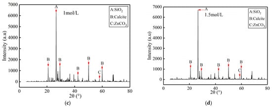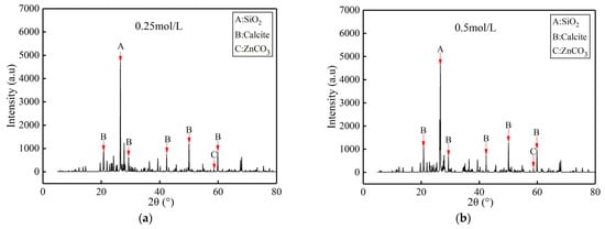 In order to further analyze the micro-properties of Zn-contaminated soil treated by MICP, the specimens with a cementation solution ratio (CaCl2:urea) of 1:2 and a curing age of 28 d were selected for XRD tests analysis, as shown in Figure 14. It could be seen that the specimens had three different mineral compositions internally: A-SiO2, the dominant substance at various concentrations; B-Calcite, the main cementing mineral, which acted as a “bridge” and cemented the loose soil particles together []; C-ZnCO3, the bound state of zinc ion and carbonate ion in the specimen. The high peaks of the calcite diffraction peaks indicated a higher production while the weaker diffraction peaks of the zinc carbonate products.