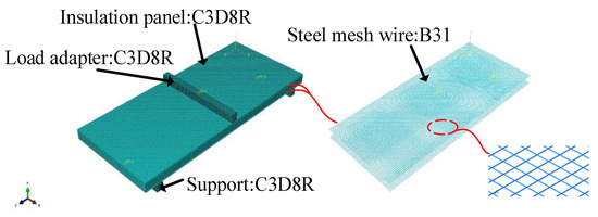 - The FE model that could reflect the flexural capacity of the embedded wire mesh insulation panel to a certain extent was obtained. The influence of different size parameters on the stiffness and flexural capacity of the panel was examined through the FE models. It was observed that the insulation cover had a significant effect on the flexural capacity. When the thermal insulation cover increased from 0.02 times the panel thickness to 0.30 times the panel thickness, the maximum load that the panel could withstand was reduced by approximately 55.2%. When the steel wire spacing and steel wire diameter were large, the flexural capacity had little effect.