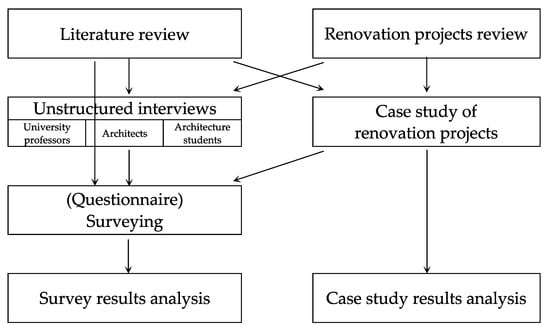 In order to achieve the set goals, the authors applied several research methods. They first analyzed relevant literature—research papers, strategic, planning, and legislative documents—which enabled the selection of the most important topics related to the research. Along with the analysis of related literature, the authors reviewed numerous renovation projects of residential buildings in Niš, Serbia, as an illustration of projects that deal with extending the life of buildings in the domestic environment. Comparing the findings of these two reviews, numerous discrepancies between theory and practice were observed. As the need for extensive and “in-depth” analysis of certain trends observed in design practice arose, the authors conducted a case study and presented five selected renovation projects of residential buildings in Niš. The goal of this part of the research was the identification of the current situation in housing renovation projects from the perspective of applying circular models. The main part of the research apparatus was conducting a survey among architects on the importance of applying the principles of the CE in AD. In order to define more precisely the objectives of the survey and the structure of the questionnaire, unstructured interviews on the basic principles of CE and the need to apply those principles in the building sector were conducted. Finally, by analyzing the results obtained from the case study and survey, recommendations for AD in accordance with the principles of the CE, as well as guidelines for taking actions to create an environment that would be stimulating for the application of the CE, were extracted.