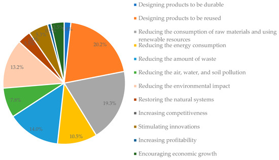 The question about the main principles of CE examines to what extent respondents can recognize the scope of CE, even though they do not have enough knowledge about it. The best-recognized principles were designing products to be reused (20.2%), reducing the consumption of raw materials and using renewable resources (19.3%), reducing the amount of waste (14.0%), reducing the impact on the environment (13.2%), and reducing the energy consumption (10.5%). The lowest number of responses referred to designing products to be durable (1.7%), increasing profitability (0.9%), and increasing competitiveness (0.0%) (Figure 2).