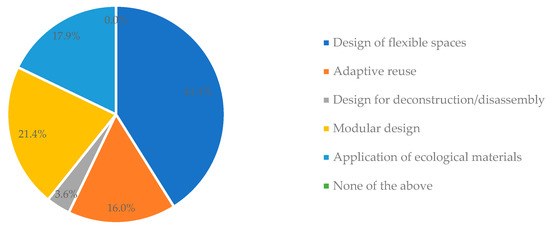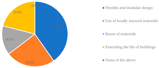 In order to switch to a circular way of doing business, the majority of respondents believe that their ASs should regularly apply flexible and modular design in AD (40.3%), followed by planning the use of locally sourced materials (24.2%) and extending the life of the building (21.0%) (Figure 10). Flexible and modular design is chosen by 78.4% of ASs engaged in the design of architectural buildings and 64.3% of ASs engaged in interior design.