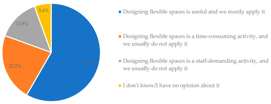 When it comes to the design of flexible spaces, even in 58.3% of cases, ASs regularly apply this method in design, in 22.2% they usually do not have enough time for this type of design, and in 13.9% they do not have enough trained staff to apply this method (Figure 4). Such results show that flexibility is recognized as a potential for extending the life of the building and that residential spaces with such qualities are more adaptable in terms of functional configuration, the possibility of future expansion, and redesigning for different purposes. All responses related to the statements that designing flexible spaces is a time-consuming and staff-demanding activity are related to ASs that have less than five employees.