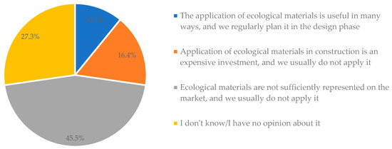 As many as 67.9% of respondents only sporadically plan the application of ecological materials for structural elements, and 64.3% occasionally plan it for waterproofing and insulation. The main reasons are almost the same—unavailability on the market (38.0% and 39.0%), the investor did not consider the application of ecological materials (28.0% and 24.4%), and the high price of ecological materials (18.0% and 22.0%).