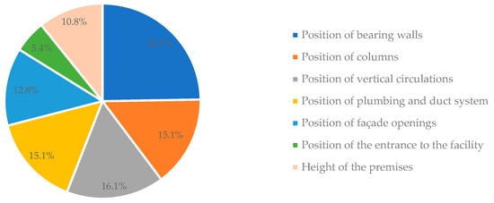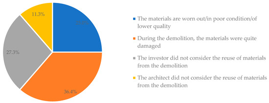 A slightly higher percentage of respondents (35.8%) than in previous questions most often plan the use of ecological materials in the interior of residential units, which may be the result of current trends in interior design, but also the first indications of a more extensive application of circular models in AD. The reasons for not using ecological materials in interior design are mainly the high price (31.2%), unavailability on the market (29.2%), and the investor who did not consider the application of ecological materials (27.1%).