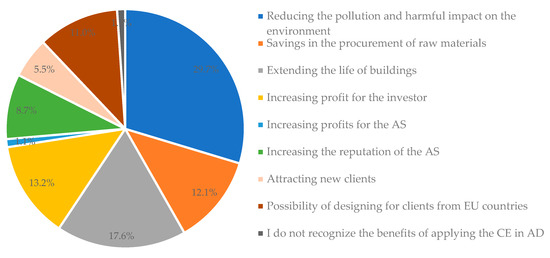 When it comes to the main benefits of applying the CE principles in AD, the largest number of respondents recognize the reduction of pollution and harmful impact on the environment (29.7%). This is followed by the extension of the building’s lifespan (17.6%), the increase in profit for the investor (13.2%), and savings in the procurement of raw materials (12.1%). Only 1.1% of the responses referred to an increase in profit for AS. These results confirm findings on the current situation in the official state program documents [47] (Figure 9).