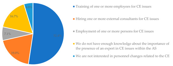 With regard to the potential personnel changes within the AS, even in 78.6% of the responses, the AS is ready for some changes in personnel in order to carry out tasks related to the CE (answers under a, b, and c combined). The majority of responses (52.4%) related to the training of employees for CE issues. It is interesting to note that 82.6% of ASs that have only architects and civil engineers among their employees are associated with this answer. Additional training of employees instead of hiring new ones would also lead to financial savings, which is very important for ASs with less than five employees, so 80.0% of them are associated with this answer. All ASs with 11–20 employees are associated with the answer related to the employment of one or more persons for CE issues. As many as 16.7% of the answers related to insufficient knowledge regarding the importance of personnel changes in this sense, and 4.7% to the lack of interest in the AS (Figure 11).