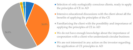 When it comes to investors and their possible familiarity with the importance of applying circular models in AD, 54.0% of the answers related to the willingness to point out to potential clients the principles of CE and the importance of their application, while 36.0% related to intensive educational discussions with the client about all the benefits of applying the CE principle. A total of 2.0% of the responses pertained to not recognizing the importance of such an approach and not being interested in any action toward the investors regarding the implementation of CE in AD (Figure 12).