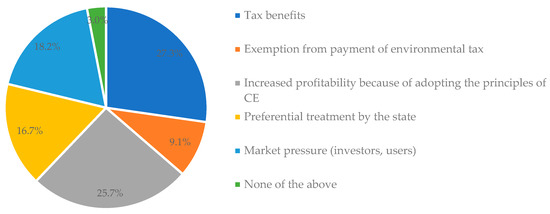 In relation to the incentives that would increase their willingness to redirect the operations of their AS towards a more intensive application of CE principles, the majority of responses related to tax incentives (27.3%). ASs of all activities and personnel structures are equally connected with this answer. This is followed by increased profitability as a result of the adoption of the CE principle (25.7%) and market pressure (18.2%) (Figure 13).