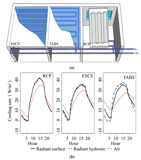 (a) Radiant cooling surfaces of different systems; (b) Comparison of cooling rates between radiant and air systems [4].
