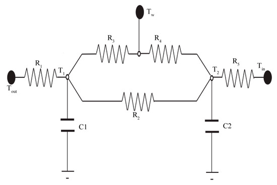 To address this issue, Liu et al. [27] proposed a method that determines these parameters from geometrical perspectives and proposed a corrected RC-network model. Additionally, Ren and Wright [28] also introduced a heat transfer model that involves the interaction between air and the floor by using the lumped parameter method (lumped model). Similarly, Koschenz and Dorer [29] developed a separate RC model to investigate the relationship between heat storage ability and pipes’ geometric shape (1D resistance model). Zhu et al. [30] also developed a theoretical model for structures with embedded pipes and conducted frequency characteristics analysis using the frequency-domain finite difference method (5R2C model). These resistance and capacity models are shown in Figure 4. Similarly, Li et al. [31] divided a concrete radiant floor into the following three parts (Figure 5): cover layer, concrete floor with embedded pipes, and insulation layer. The cover layer and insulation layer were simplified as a one-dimension RC model, which has two resistances and one capacitance. The heat transfer in the slab with embedded pipes was calculated by a coupled RC model, which describes the heat transfer process between the concrete floor and the internal hydronic system. The experiment demonstrated that the errors of the coupled RC model were within 5.5%. The simplified RC network model can predict the dynamic heat performance of a radiant floor with multi-layers.