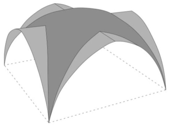 The edge vault is commonly deemed to be an evolution of the cross vault []. The most important difference between those vaults is that the edge vault does not need a complete centering and it can be self-supporting at each stage of its partial completion. These features result from the progressive reduction of the four groins, which permits the vault to stand as a partial construction at each stage with a “cantilevered” profile [].