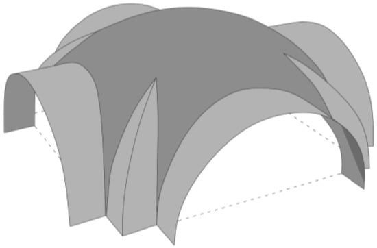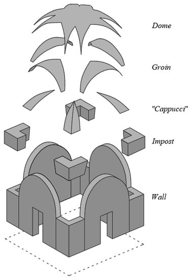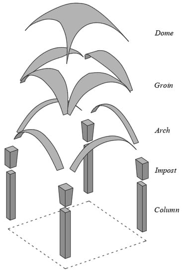 Both types consist of the “appese” (imposts), which represent the base of the vault resting on the columns, the “formate” (arches) and the “unghie” (groins or panel) representing, respectively, the arches mounted on the imposts and their protrusion toward the center of the room, and the “calotte”, the spherical dome closing the vault top (Figure 8 and Figure 9) [].