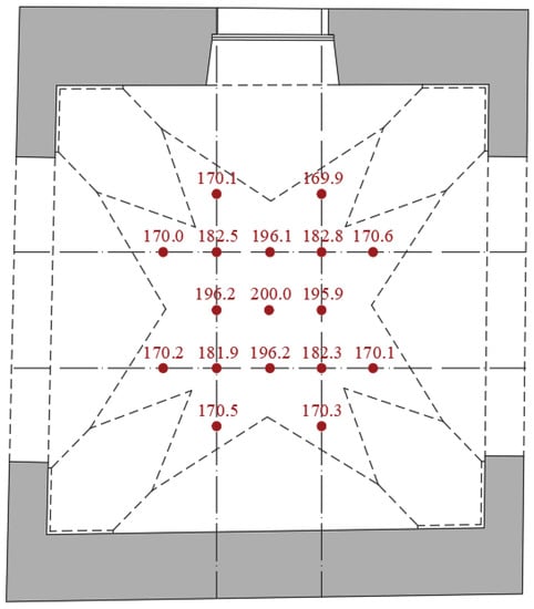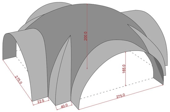 The geometrical data were extracted on the basis of both previous surveys carried out by local architects and a survey performed by one of the authors. All these survey campaigns allowed the extraction of the main geometrical data of the vault (most significant plan sizes, thickness of the vault, curvatures in some critical points, wall thickness), which are reported in Figure 11, and of the crack framework, paying attention to the cracks that turned out to be passing through the thickness during the authors’ survey.