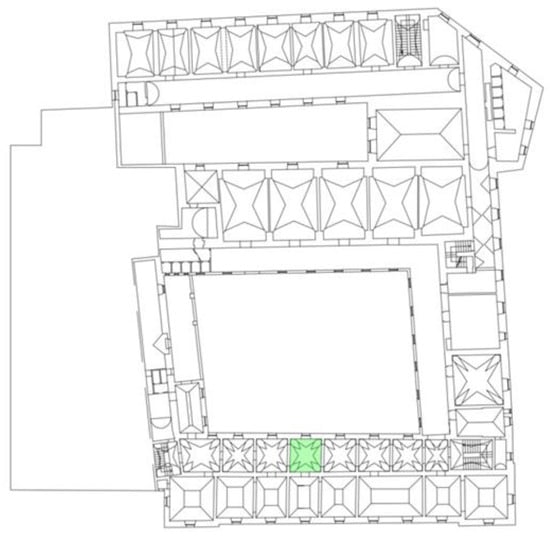 An incremental analysis [] was carried out for a room, highlighted in green in Figure 16, covered with an edge vault and extrapolated from the rest of the building. The room is square-shaped; it is located on the first floor and it presents some cracking distributed throughout.