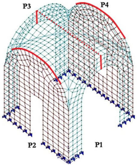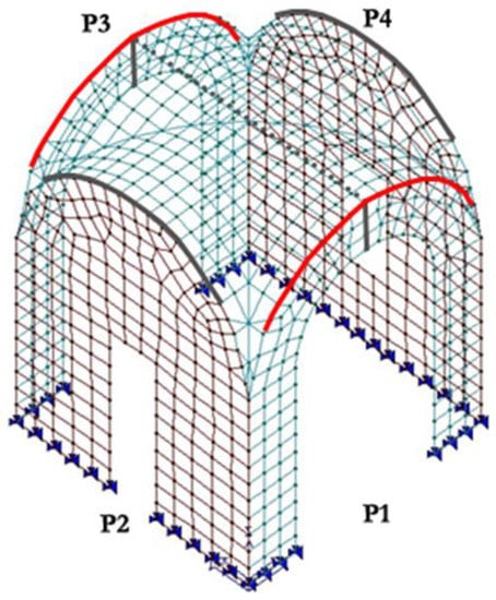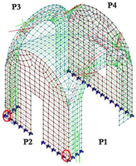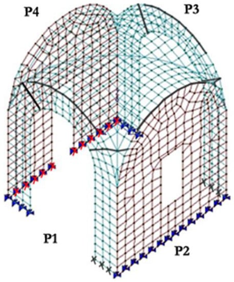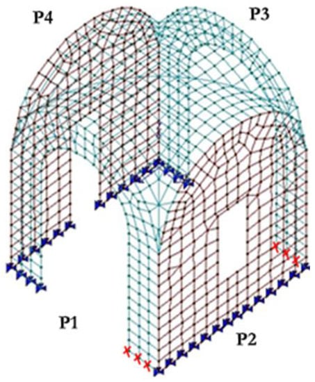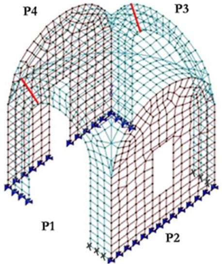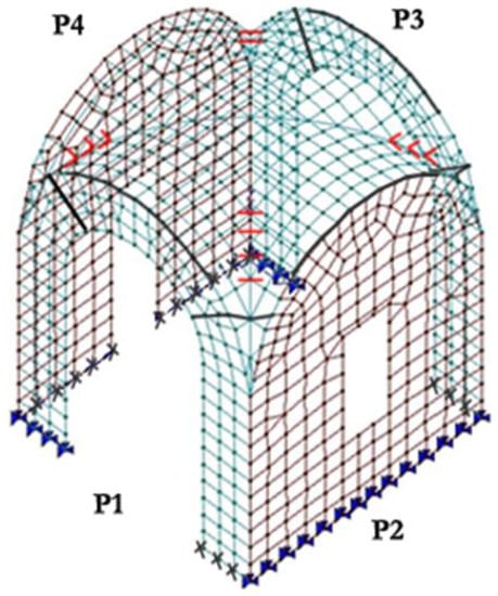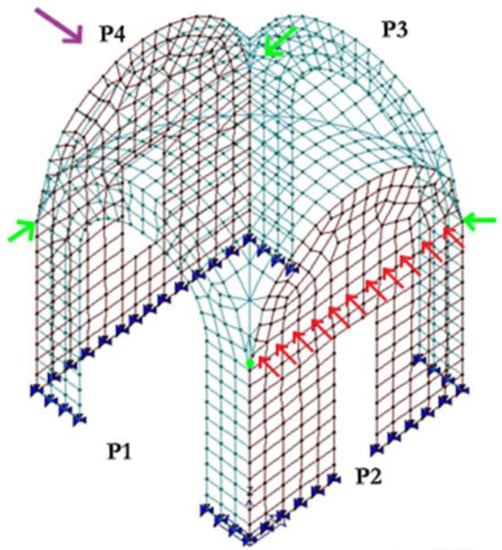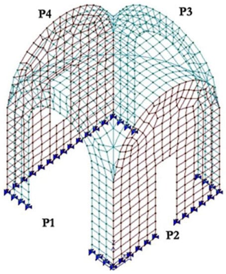 It is worth emphasizing that the specific weight is applied to each element of the mesh with the assumption that the thickness (see also Section 3) is 0.2 m. Due to the curvature of the vault, the weight is not applied uniformly on the horizontal projection, but its distribution is variable and computed automatically by the discretization process. The total weight of the vault is around 76.8 kN, which is equivalent to 4.8 kN/m2 of the horizontal projection. The same specific weight is applied to the vertical masonry piers, whose equivalent load is computed automatically and applied uniformly on each element, but due to their straight vertical shape, it is simply equivalent to a load per unit length of specific weight*B*s, where B and s are the length and the thickness, respectively, of the pier. The live load is computed in compliance with the Italian Technical Norm [] with the knowledge that the vault is a roof, and therefore, assuming snow and maintenance actions, the former depends on the geographic area and is quantified at 0.5 kN/m2 in the location of the monastery, with the latter being a common maintenance load.