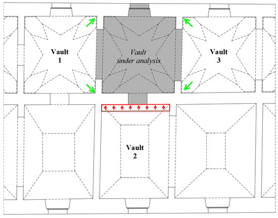 In order to compute the thrust due to the adjacent vaults, a single static analysis was carried out for each of the three adjacent vaults (see Figure 19). Each vault was loaded by its weight (16 kN/m3 on a thickness of 0.2 m for all the vaults) and its live loads (1 kN/m2 of horizontal projection for all the vaults). The computed thrust is reported in Table 1 and applied to the square vault under analysis (see Figure 20).