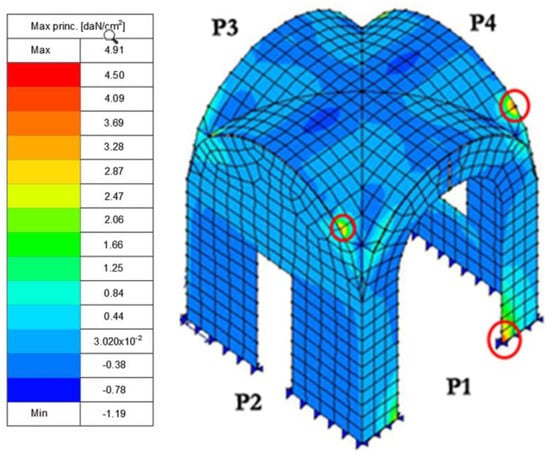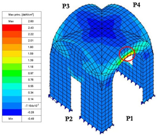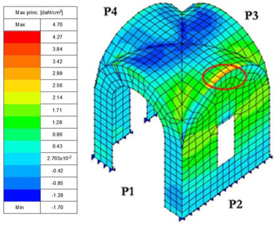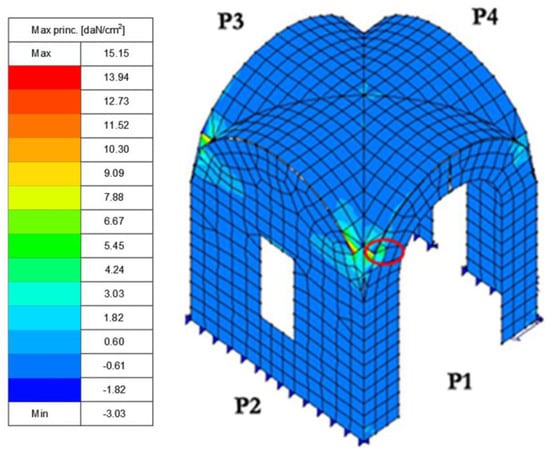 Location of the maximum values of tensile stress (extrados of the arch of walls P1 and P3). Vertical + seismic load.