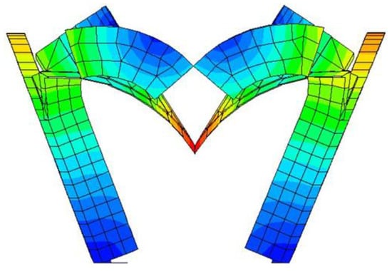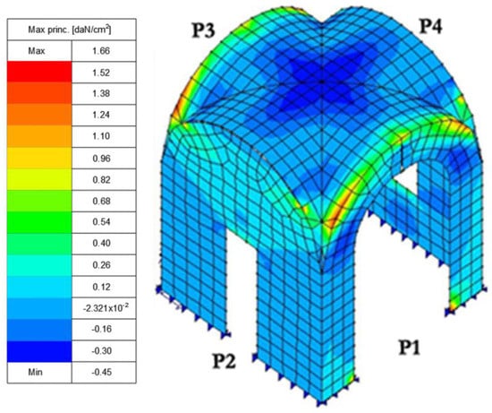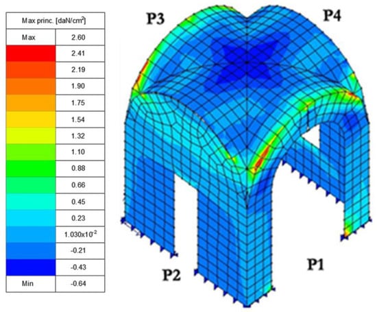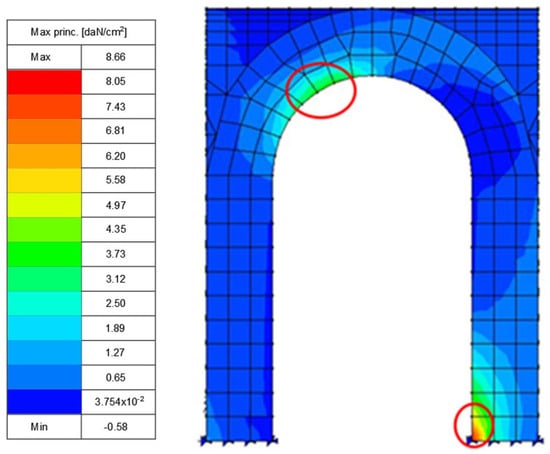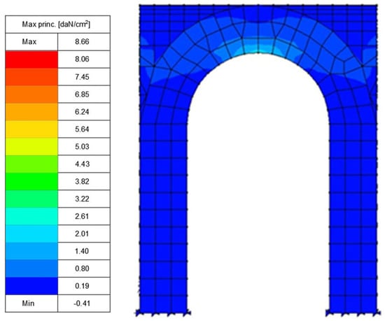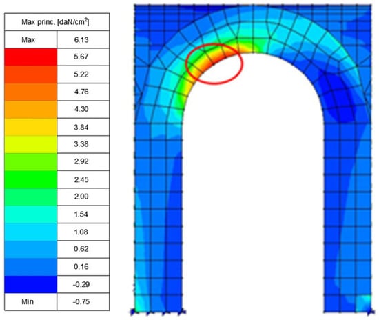 Since the main goal of the analysis is to investigate the behavior of the vault up to the collapse, the load combinations (the static with vertical load and the seismic with horizontal load) are not affected by amplification factors (as suggested by [,]). Furthermore, the normal yield (compressive and tensile) stresses were taken to be close to the characteristic value, i.e., without any reducing coefficient.