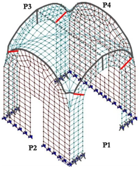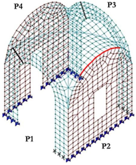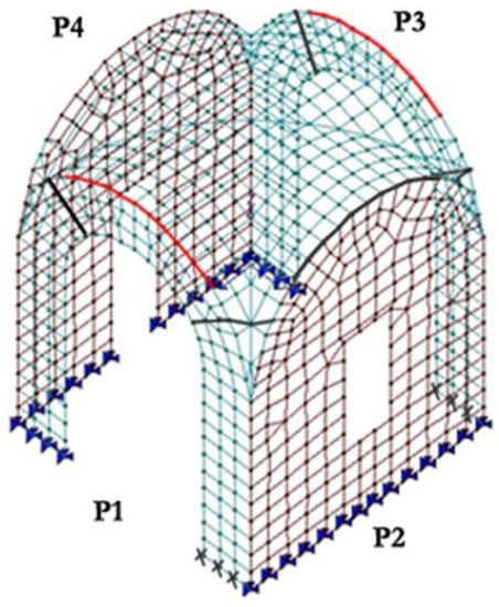 Crack framework: in red the cracks along the arches P1 and P3. Vertical + seismic load.