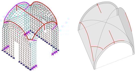 Figure 48 shows high values of tensile stress along the diagonal arches of the vault. For this reason, cracks were inserted perpendicular to the diagonal arches (Figure 49).