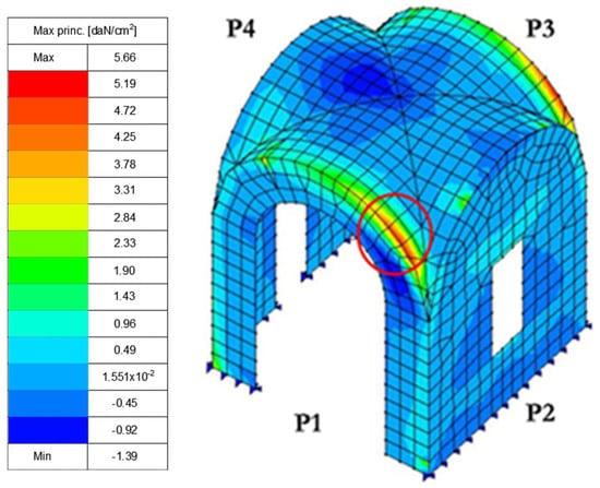 The stress map (Figure 42) shows that the maximum value of tensile stress occurs on the extrados of the arch of walls P1 and P3, highlighted by a red circle. For this reason, a crack was inserted; the procedure was repeated step by step by detaching one element per time where the maximum stress occurs. Finally, a hinge on the intrados of the arch was created and the crack propagates on the vault (in the corner), as Figure 43 shows.