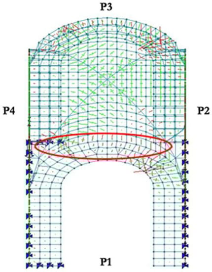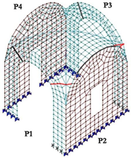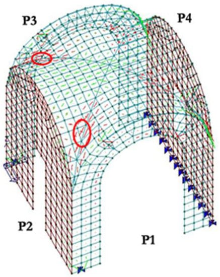 Figure 44 shows in green the compression isostatics and in red the traction isostatics; high values of tensile stress are recorded along the intersection line between the calotte and arch of walls P1 and P3. For this reason, a crack was inserted along the extrados of the arch, detaching one element per time where the maximum stress was reached; see Figure 45.