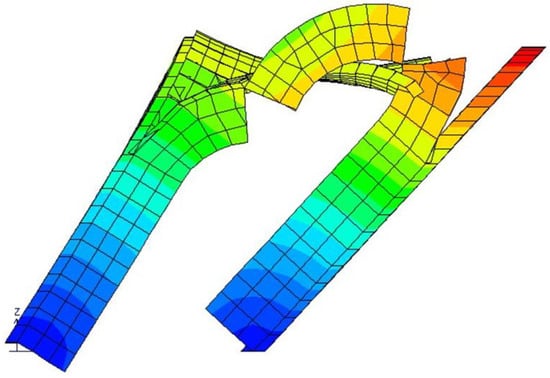 Figure 35 shows that there is a maximum tensile stress in the lower right edge, so that support has been removed. Also, in this case, the procedure is repeated step by step by detaching one element per time where the maximum stress is reached. Finally, the supports’ removal led to the formation of an external hinge (Figure 37).