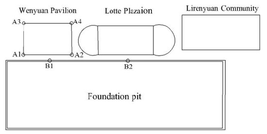 Schematic diagram of the building and monitoring points around the foundation pit.