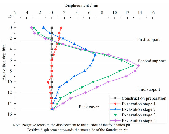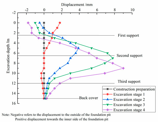 Figure 3 depicts the variation in the horizontal displacement of the diaphragm wall at B1 during different construction stages. As the excavation depth of the foundation pit increases, the horizontal displacement of the diaphragm wall gradually increases. Overall, the horizontal displacement of the diaphragm wall exhibits a fish-belly shape, meaning that as the depth increases, the horizontal displacement initially increases, then subsequently decreases. After completion of the four construction stages, the maximum horizontal displacement of the diaphragm wall is 1.9 mm, 3.8 mm, 7.8 mm and 9.6 m occurring at excavation depths of 0 m, 5 m, 7.2 m, and 9 m, respectively. As can be seen, with increasing excavation depth, the maximum horizontal displacement of the diaphragm wall gradually increases. In addition, after the completion of construction stages 2, 3 and 4, the top of the diaphragm wall experienced displacement towards the outside of the foundation pit. This is mainly due to the external force exerted by the internal support on the diaphragm wall, which suppresses the deformation of the diaphragm wall caused by the unloading of the foundation pit soil.